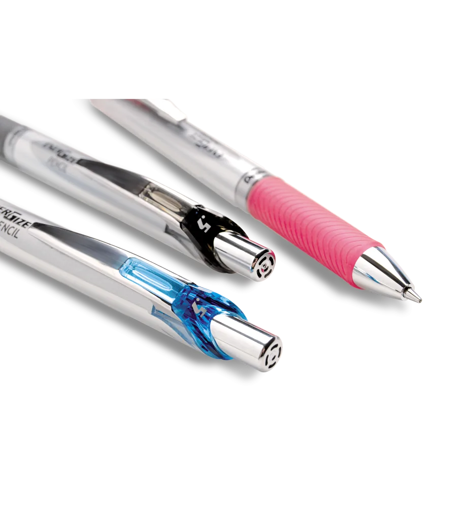 Ołówek automatyczny EnerGize w stylistyce linii EnerGel. Podwójny system przyciskowy zabezpiecza końcówkę przed uszkodzeniem i chroni grafit przed złamaniem. Po pierwszym kliknięciu końcówka typowa dla długopisu, po drugim grafit w odpowiedniej długości. Obudowa o idealnie wyważonym punkcie ciężkości. Kolorowy, gumowy, antypoślizgowy uchwyt gwarantuje komfort użytkowania. Metalowy klips do wpięcia w notes lub kieszeń. Pasuje do kompletu z BL77 i BLN75 z serii EnerGel.