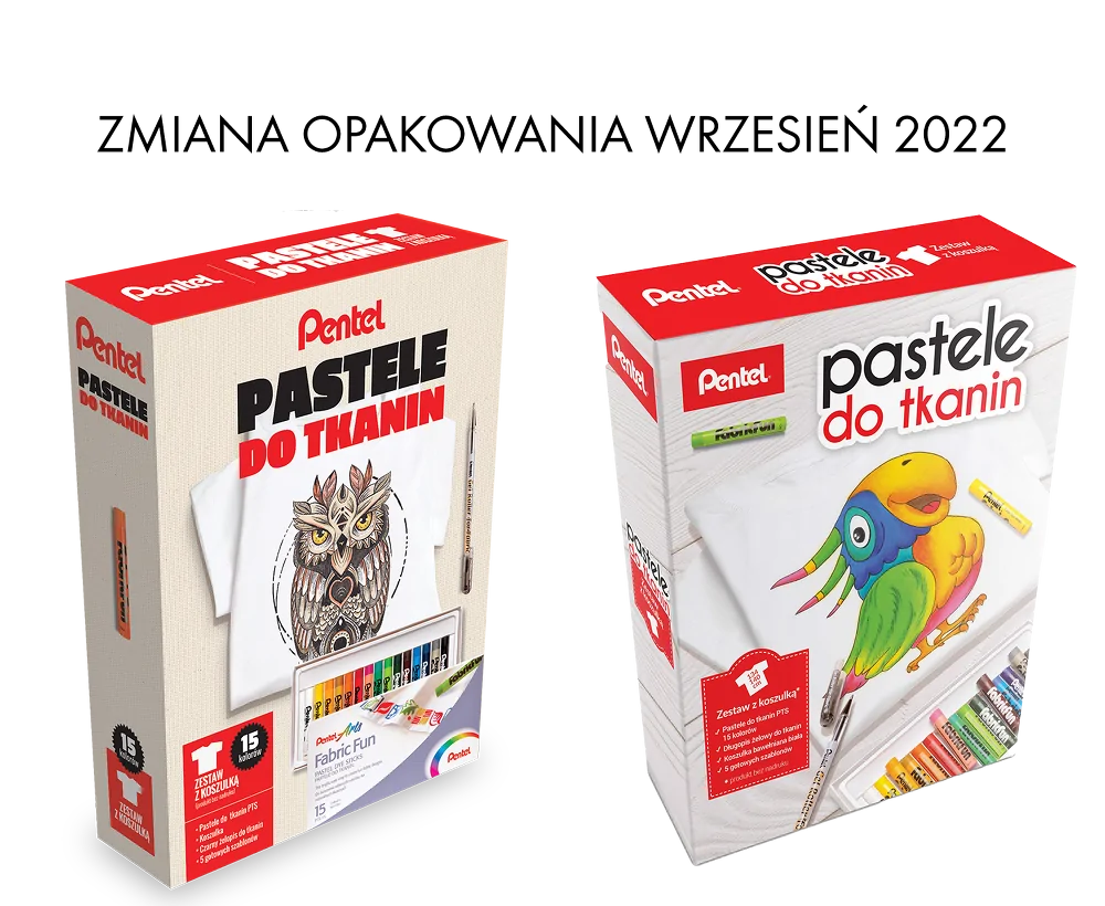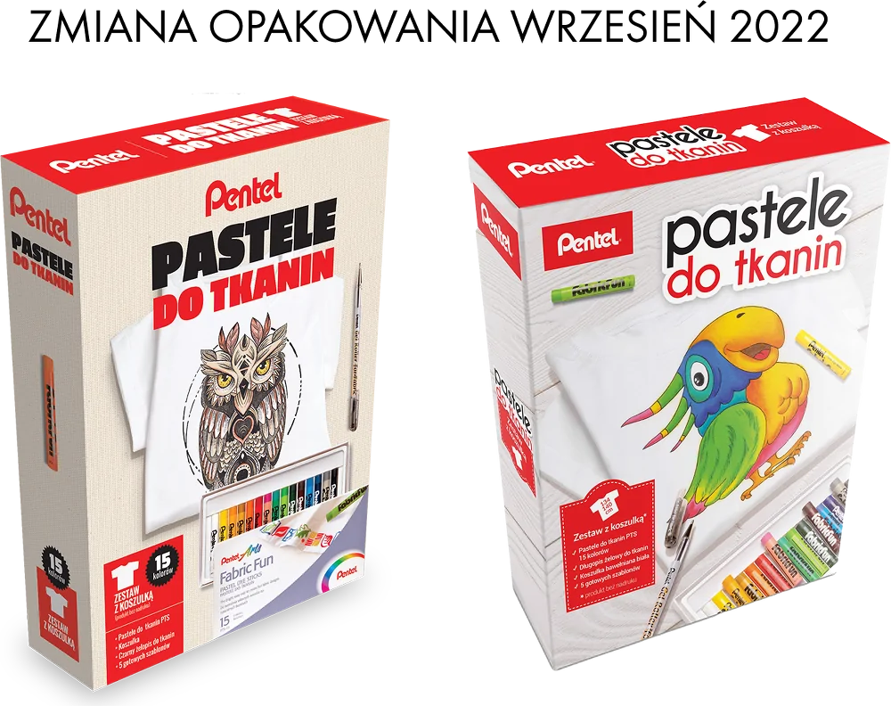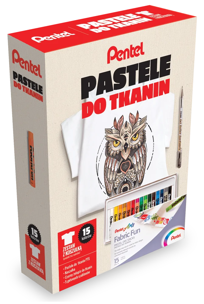 W zestawie: pastele do tkanin, długopis żelowy, koszulka