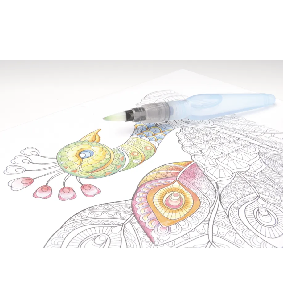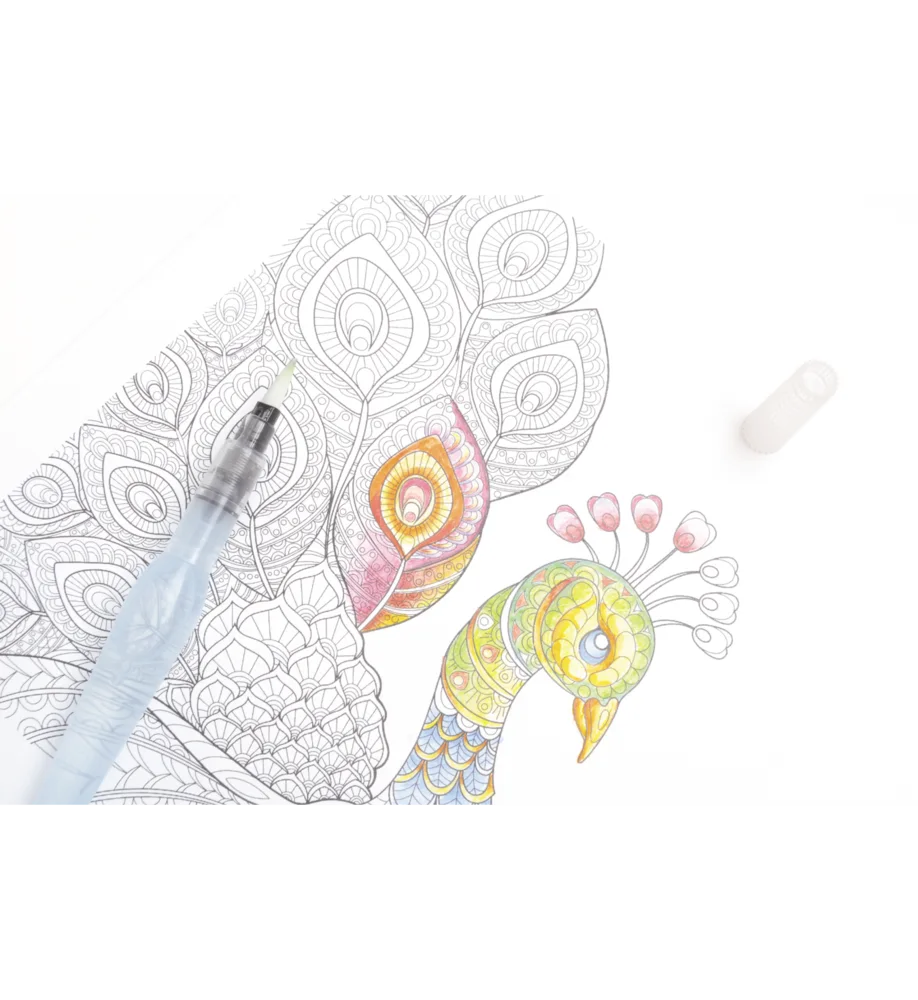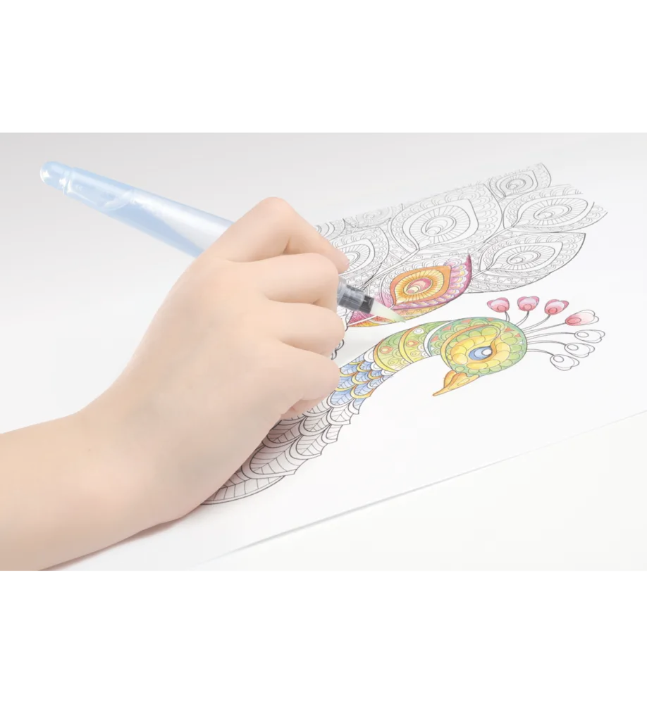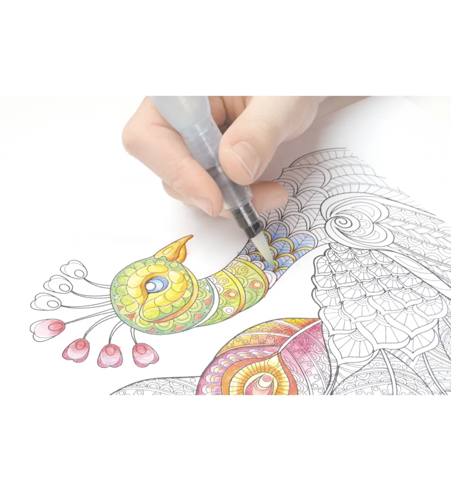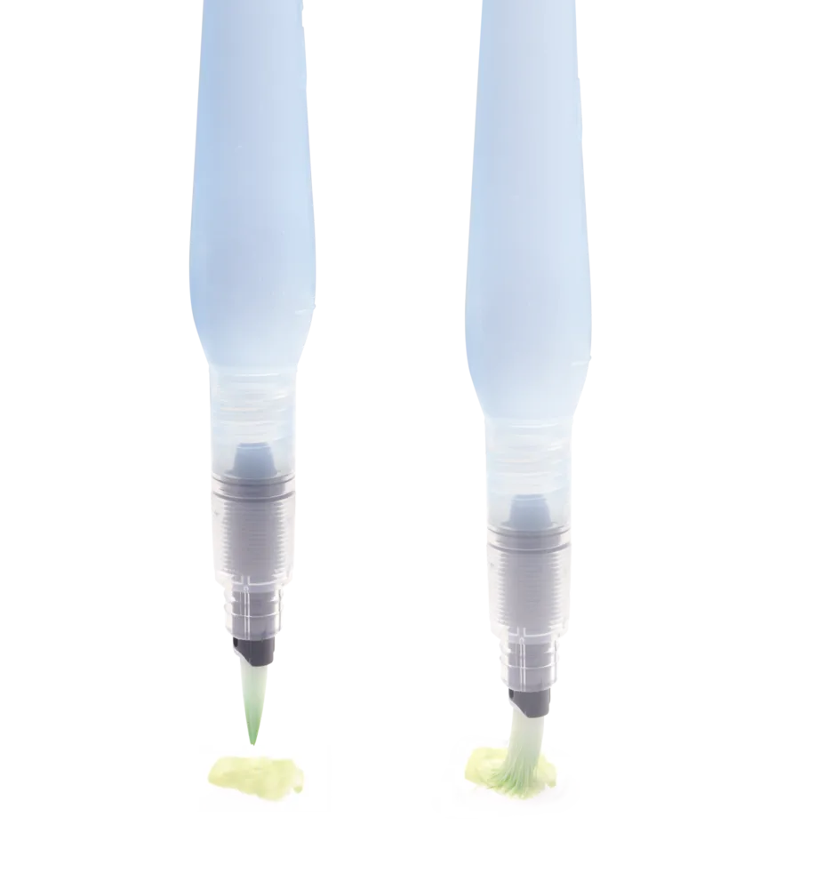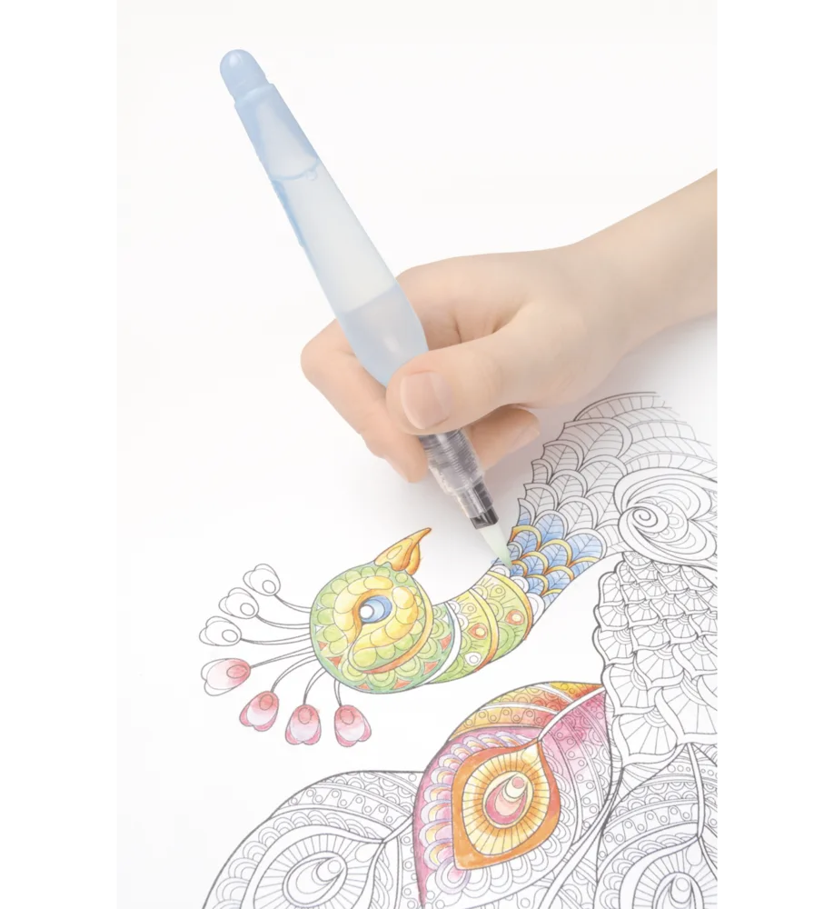 Pędzelek wodny FRH. Niezastąpiony w pracy z akwarelami i kredkami akwarelowymi. Do tworzenia ilustracji, pejzaży, melancholijnych obrazów. Prosty w obsłudze, łatwy w czyszczeniu (moczymy go w wodzie). Służy do rozmazywania kolorów. Higieniczny i wygodny w użytkowaniu. Zastępuje tradycyjny pędzelek i kubek na wodę. Przezroczysta obudowa pozwala kontrolować ilość płynu w zbiorniczku. Poprzez delikatne ściśnięcie obudowy doprowadzamy wodę do końcówki.