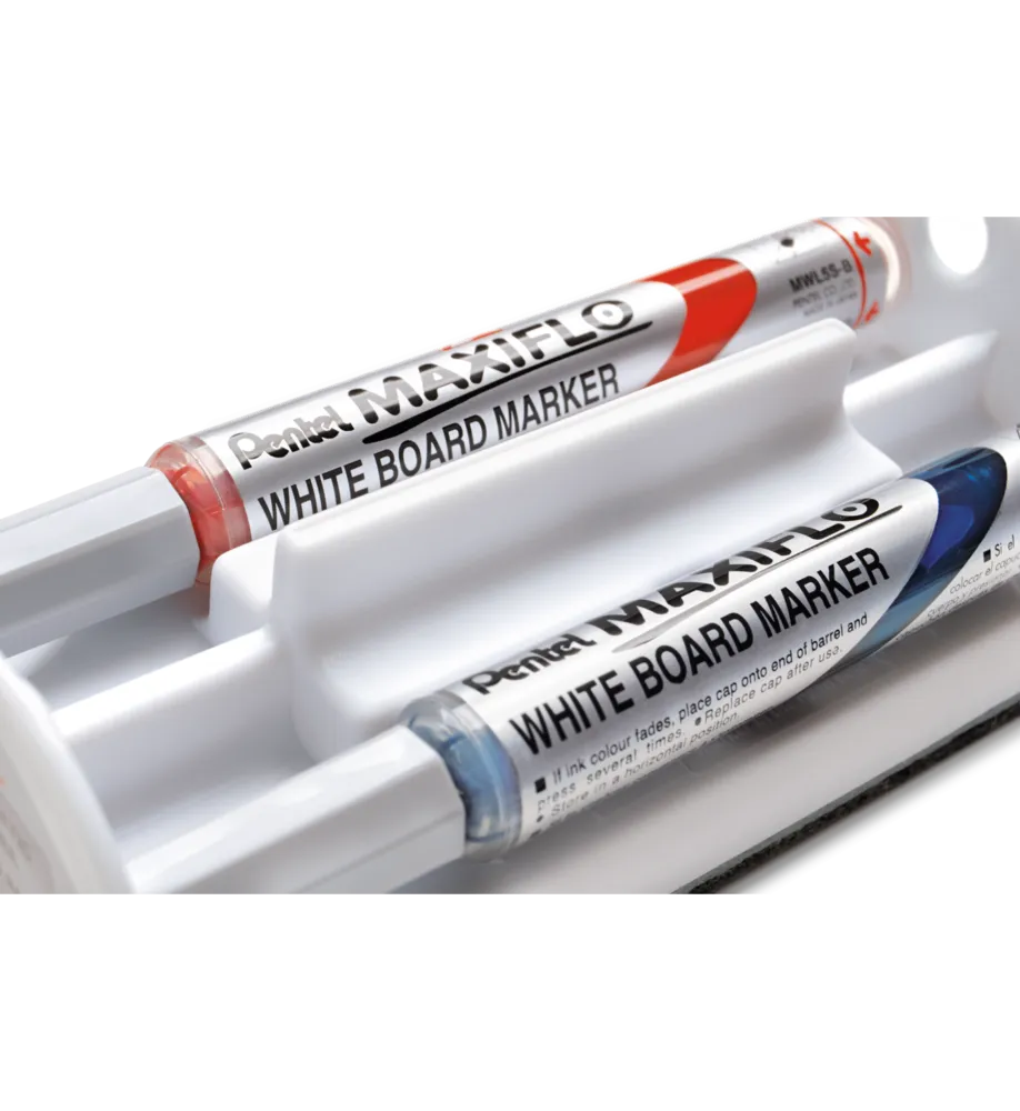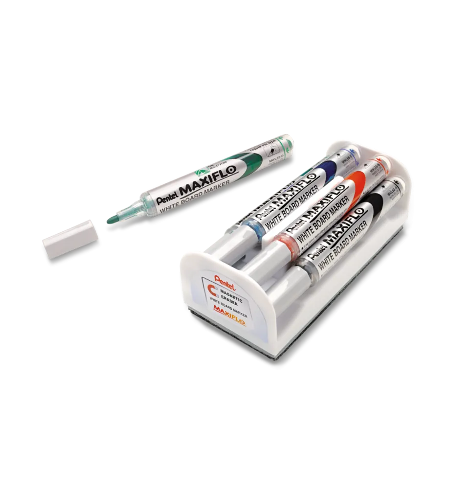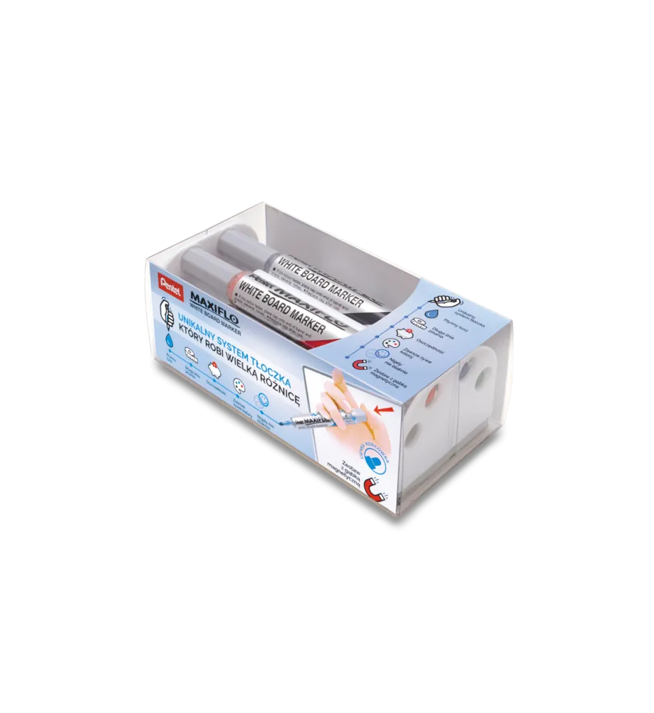 Marker MAXIFLO do białych i ceramicznych tablic. Płynny tusz dozowany w razie konieczności nawilżenia końcówki za pomocą tłoczka (zamiast tradycyjnego sączka). Marker pisze wyrazistą linią aż do ostatniej kropli tuszu. Kilkakrotnie dłuższa linii pisania niż w standardowych markerach z sączkiem - 1200 m. Nie zawiera substancji trujących ksylenu ani toluenu. Nadaje się na papier, plastik, karton, tablice suchościeralne. Zestaw MWL5S-STABCDPL / (MWL5S-4N) zawiera 4 markery (czarny, czerwony, niebieski, zielony) oraz gąbkę magnetyczną.