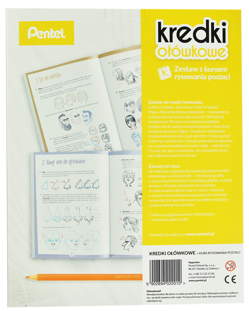 W zestawie bogato ilustrowany kurs rysowania postaci, kredki ołówkowe 24 kolory, ołówek i gumka. Kurs wyjaśnia i pokazuje, że rysowanie to sztuka, której można się nauczyć cierpliwie i dokładnie studiując kolejne kroki. Książeczka podzielona jest na 14 tematycznych rozdziałów: oczy, nos, uśmiech, twarz, głowa, uszy, włosy, emocje, ciało, ręce, nogi, tors i pośladki, ruch, ubranie. Z takim przygotowaniem i narzędziami – rysować każdy może!
